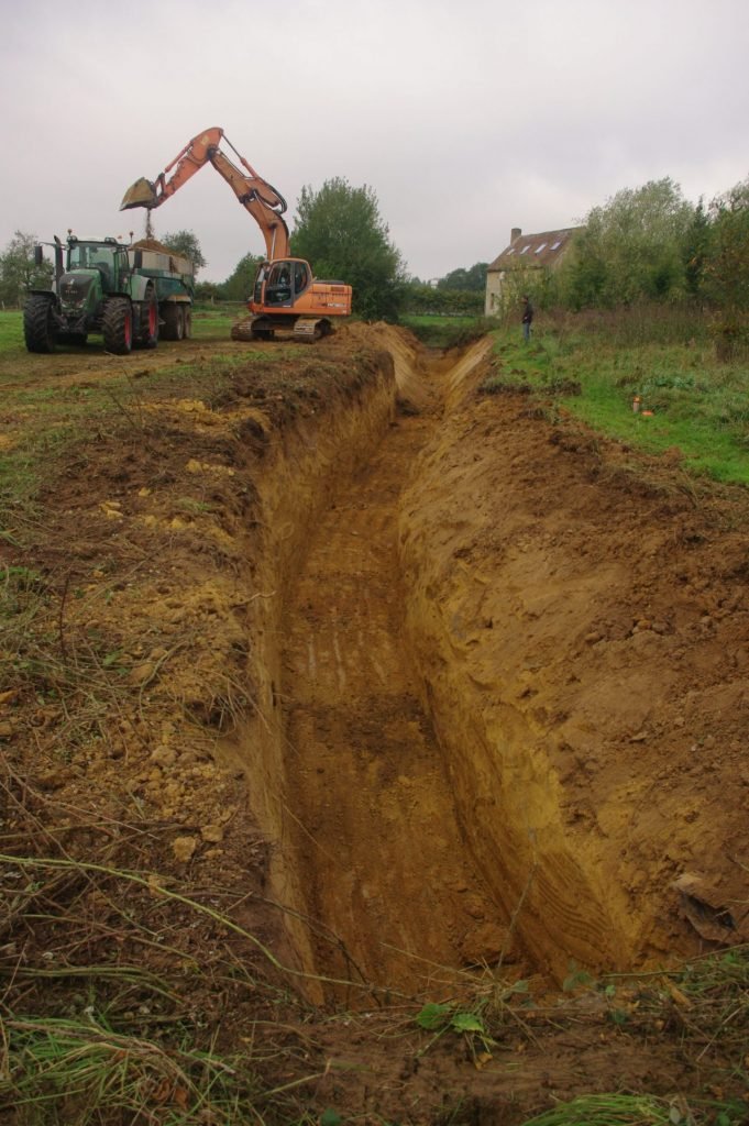 First of all, we had to find out how far down we could go without piercing the clay layer which holds the water in the pond. It turns out that we have “limon” soil (decomposed organic matter) from 0cm to 70cm and then clay from 70cm to 3m60, so that gives us plenty of margin for error. (See here for the story of excavating the test holes).